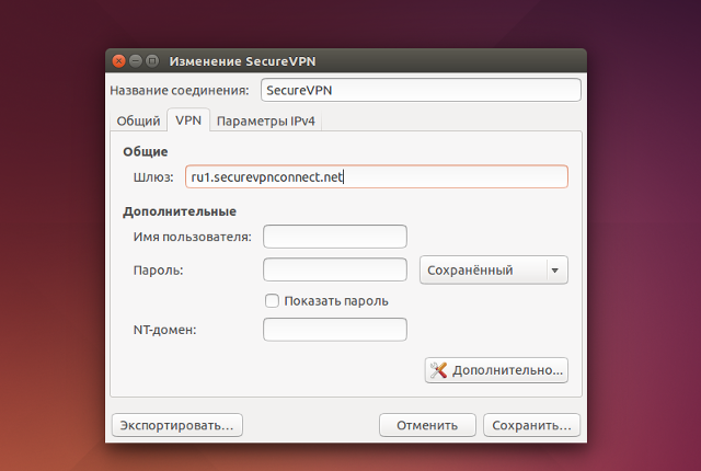 Приведенная инструкция демонстрирует процесс настройки VPN-соединения по протоколу PPTP для операционной системы Linux Ubuntu. В зависимости от используемого Вами дистрибутива Linux, могут иметься отдельные особенности в настройке. Если у Вас возникнут затруднения по настройке - смело обращайтесь в нашу службу техподдержки.